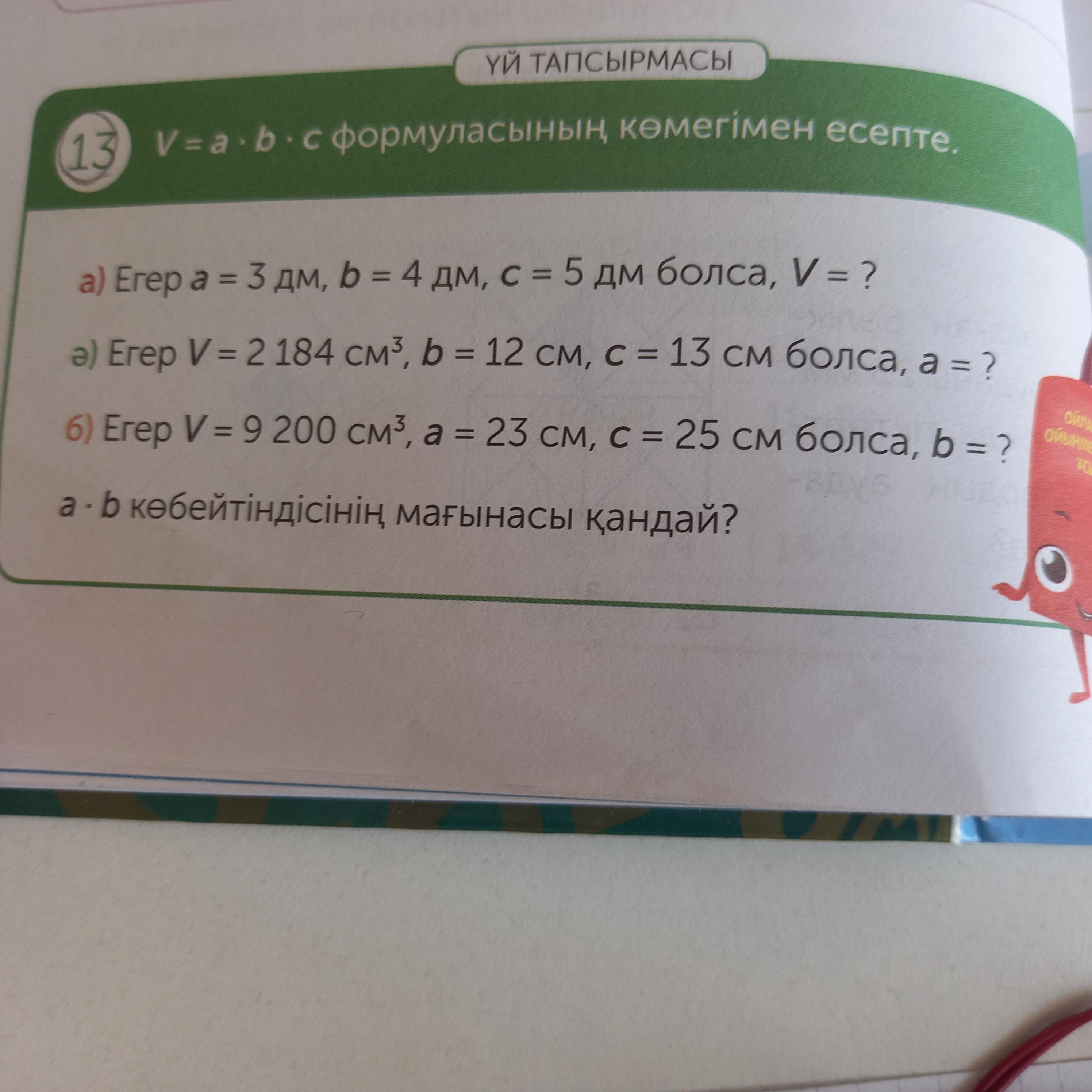 Шешуі: V=a×b×c=3×4×5=60 дм³