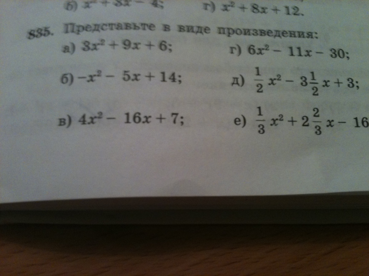 По возможности выносите за скобку. Например, в первом задании можно вынести 3, во втором -1, в пятом 1/2, в шестом 1/3. Далее приравниваете выражение к нулю и решаете как квадратное уравнение. Используя корни этого уравнения разложите выражение на множители.