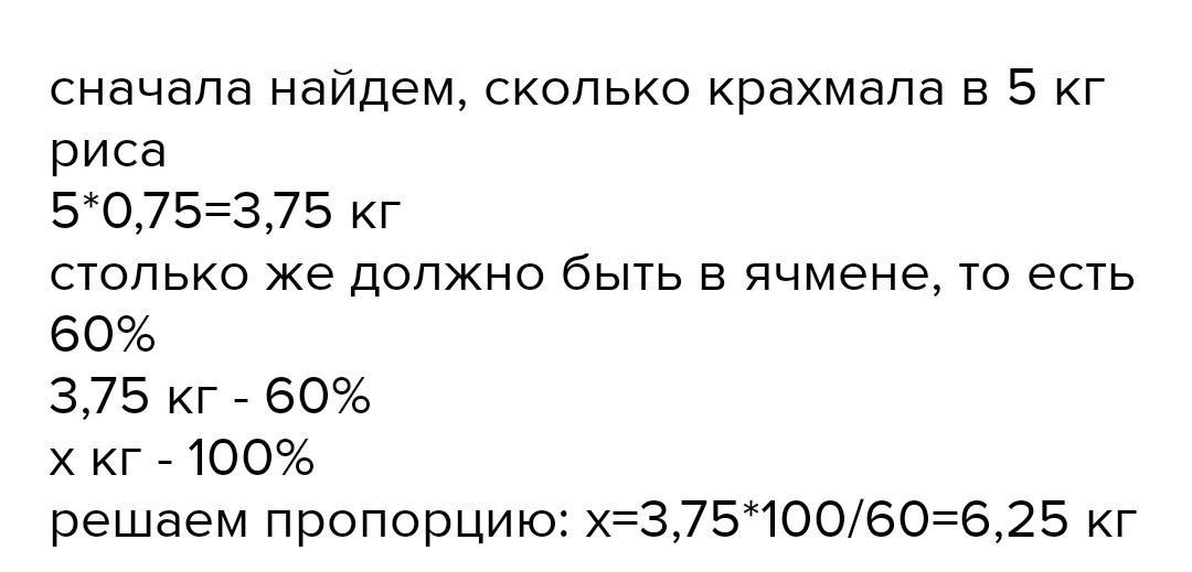 . Кукуруза содержит 75% крахмала, а пшеница 60%. Сколько надо взять пшеницы, чтобы в нем содержалось столько же крахмала, сколько его содержится в 9 кг кукурузы? *