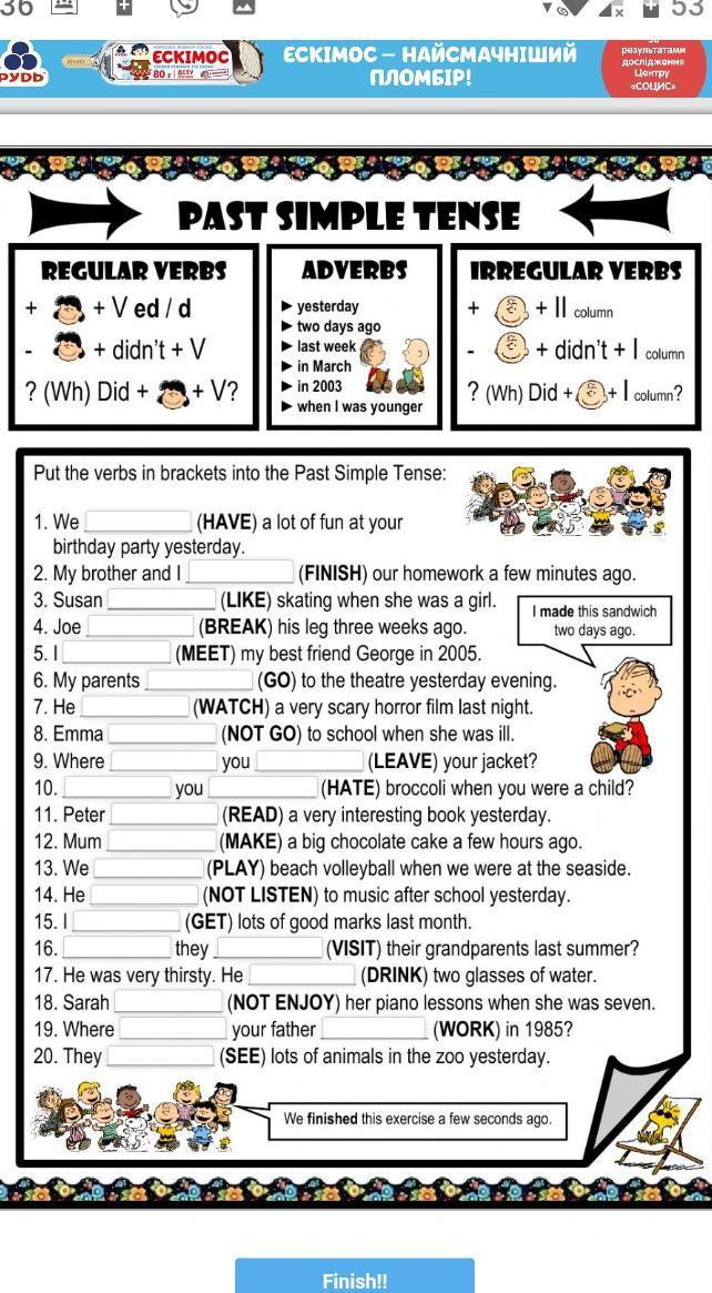 1. had. 2. finished. 3.liked 4.broke. 5.met. 6.went 7.watched 8. didn’t go. 9.where, leave 10.Did, hate 11.read 12.made 13.played 14.didn’t listen 15.got 16.did, visit 17.drank 18. didn’t enjoy 19. was, work 20. saw