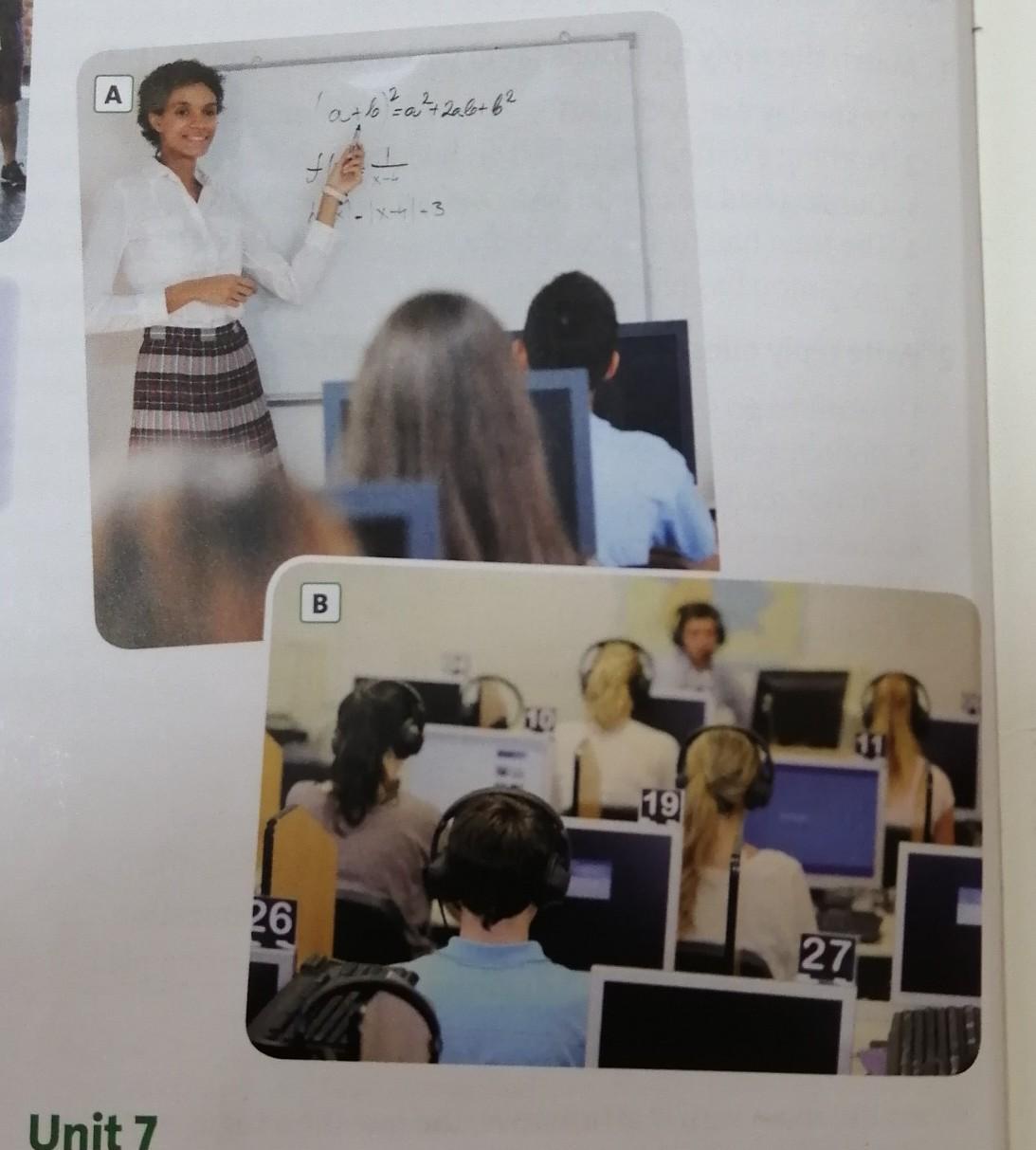 At the picture B we can see that boys and girls are at the lesson IT .