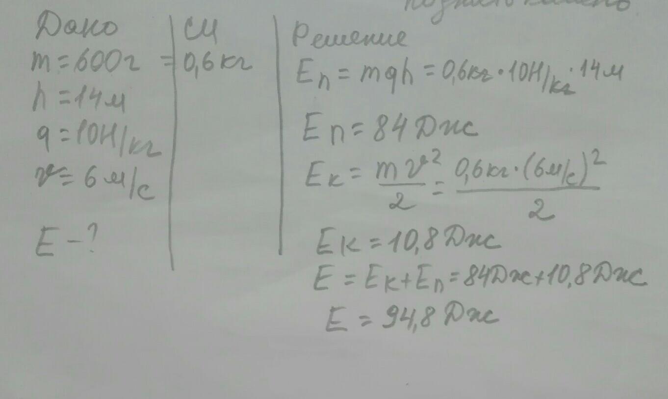 m=600г h=14м g=10н/кг V=6м/с E-?