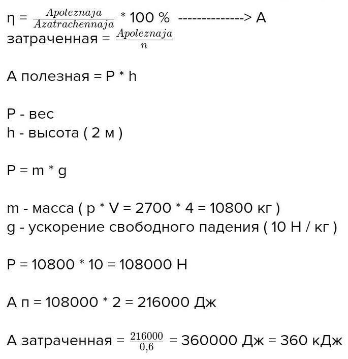 пожалуйста срочно дам 100 баллов какую работу необходимо совершить для подъема гранитной плиты объёмом 4м³ на высоту 2м при помощи механизма с КПД 60%