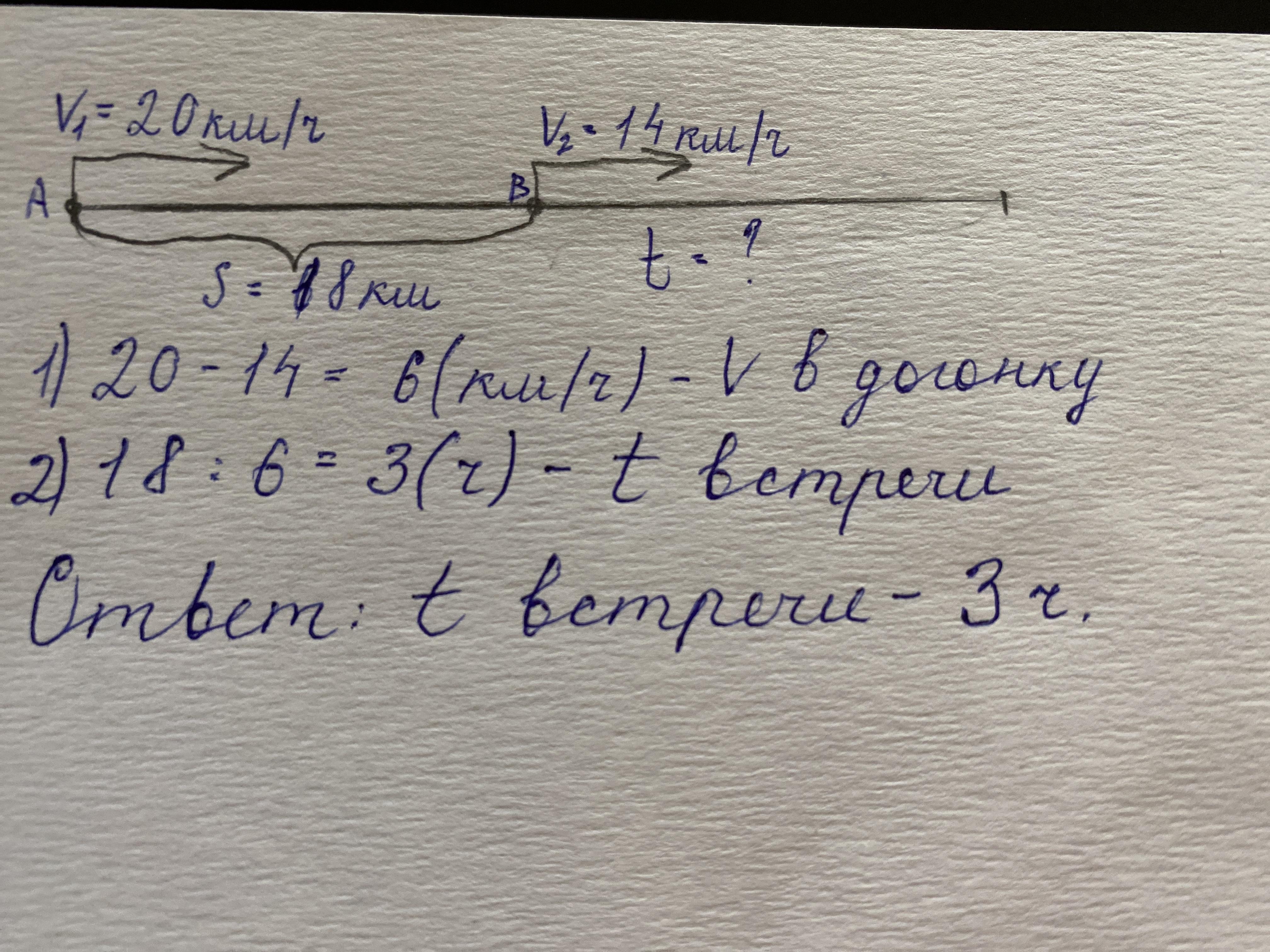 Из пункта А и из пункта В, расстояние между которыми 18 км, выехали одновременно в одном направлении два велосипедиста. Расстояние между А и В - 18 км. Скорость первого велосипедиста 20 км/ч, второго - 14 км/ч. Через сколько времени первый велосипедист догонит второго?