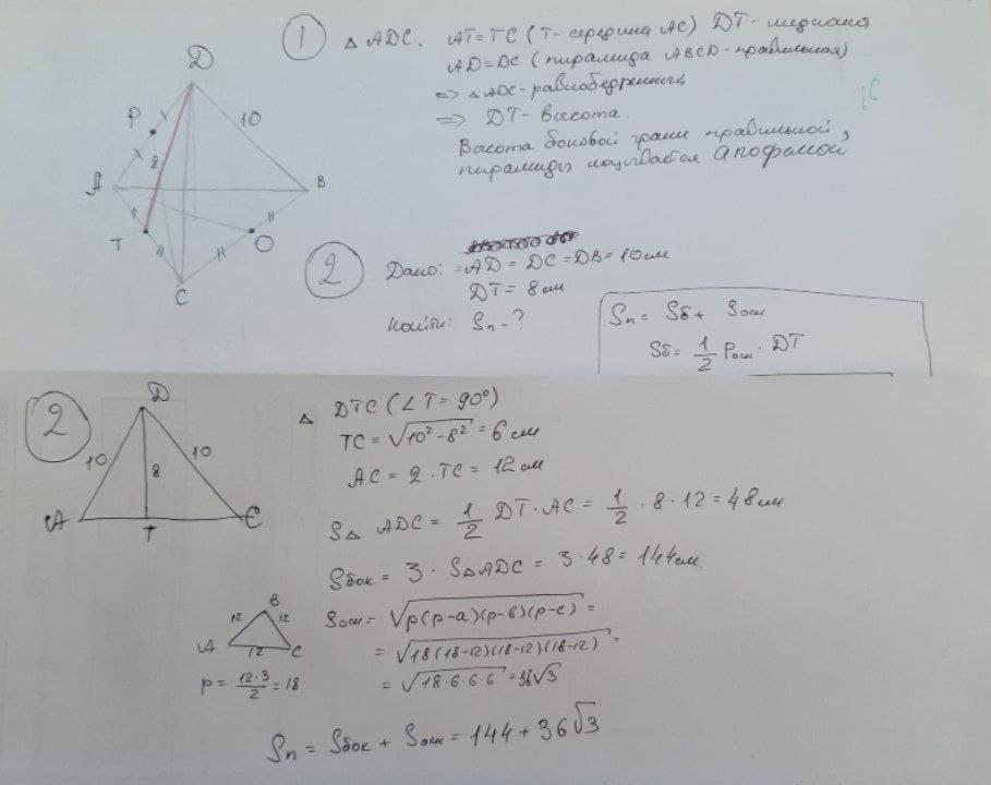 2) Дано: АВ=ВС=АС=АД=ДС=ДВ=10 см (DABC - правильная треугольная пирамида) ; ДТ = 8 см