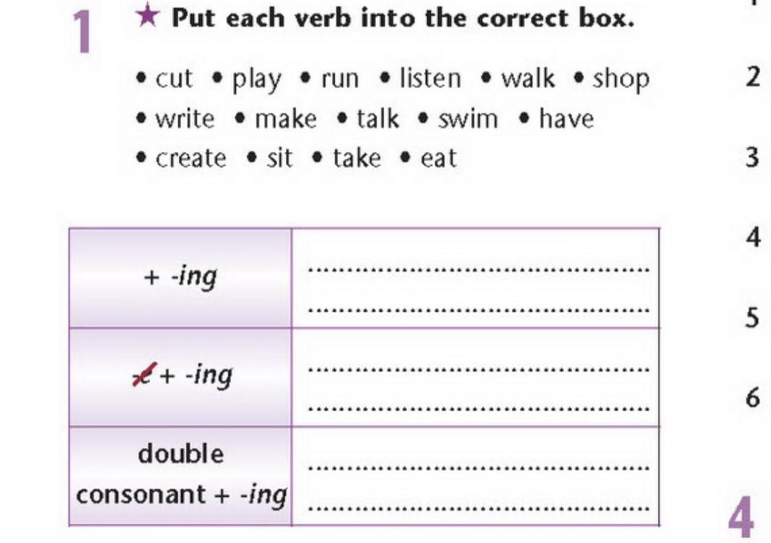 1. + -ing. play, listen, walk, talk, eat. 2. write, make, have, create, take. 3 run, swim, shop, sit.