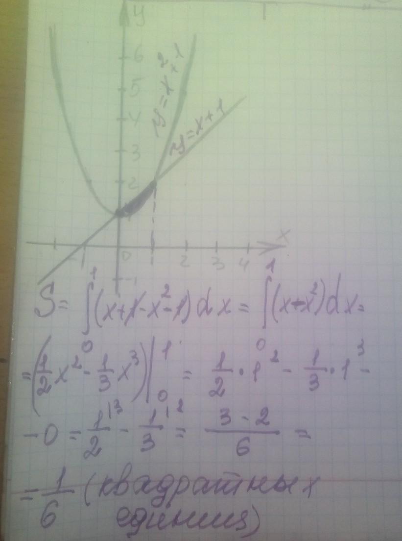 S= ∫_0^1 (х+1-х^2-1)dx = ∫_0^1 (х-х^2)dx = (1/2x^2-1/3x^3)|_0^1 =1/2-1/3-0-0=(3-2)/6=1/6
