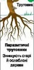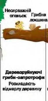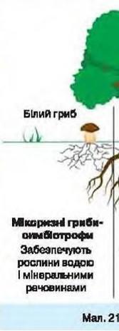 Усі групи грибів у природі взаємопов'язані. 2. Як взаємодіють дерева та мікоризні гриби? Джерелом поживних речовин гриба є органічні речовини від кореневих систем рослин, з якими їх міцелій вступає у взаємовигідний симбіоз (мікоризу)
