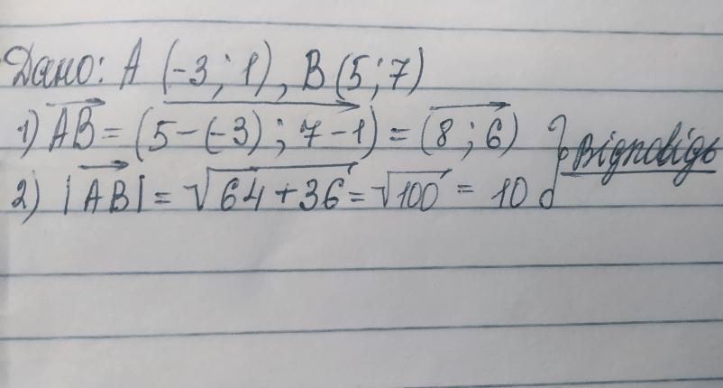 4. Знайдіть координати вектора АВ та модуль, якщо А( -3;1), B(5;7).