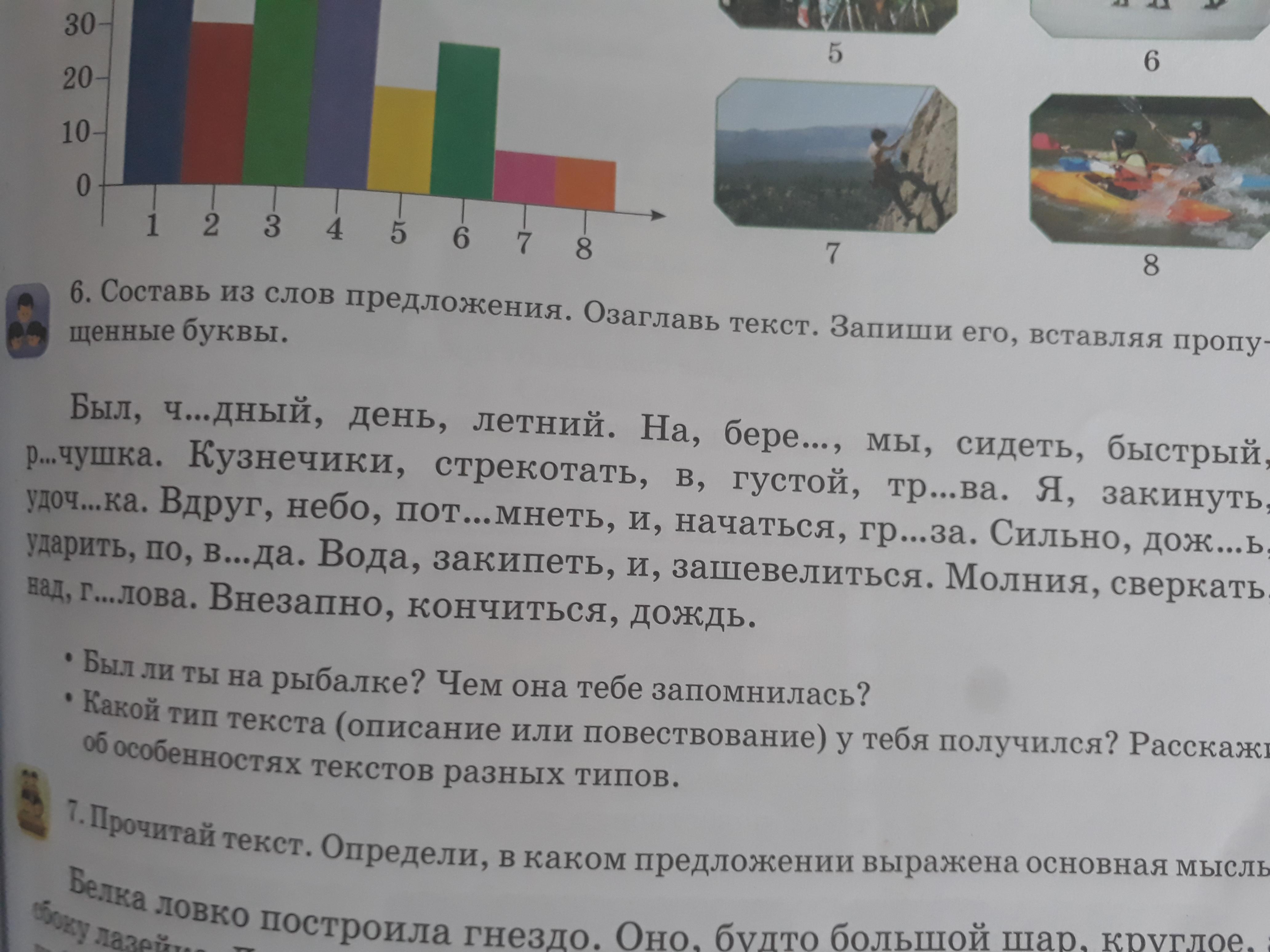 Был чудный летний день. Мы сидели на берегу быстрой речушки. Кузнечики стрекотали в густой траве. Я закинул удочку. Вдруг небо потемнело, и началась гроза. Дождь сильно ударял по воде. Вода закипела и зашевелилась. Молния сверкала над головой. Внезапно закончился дождь.