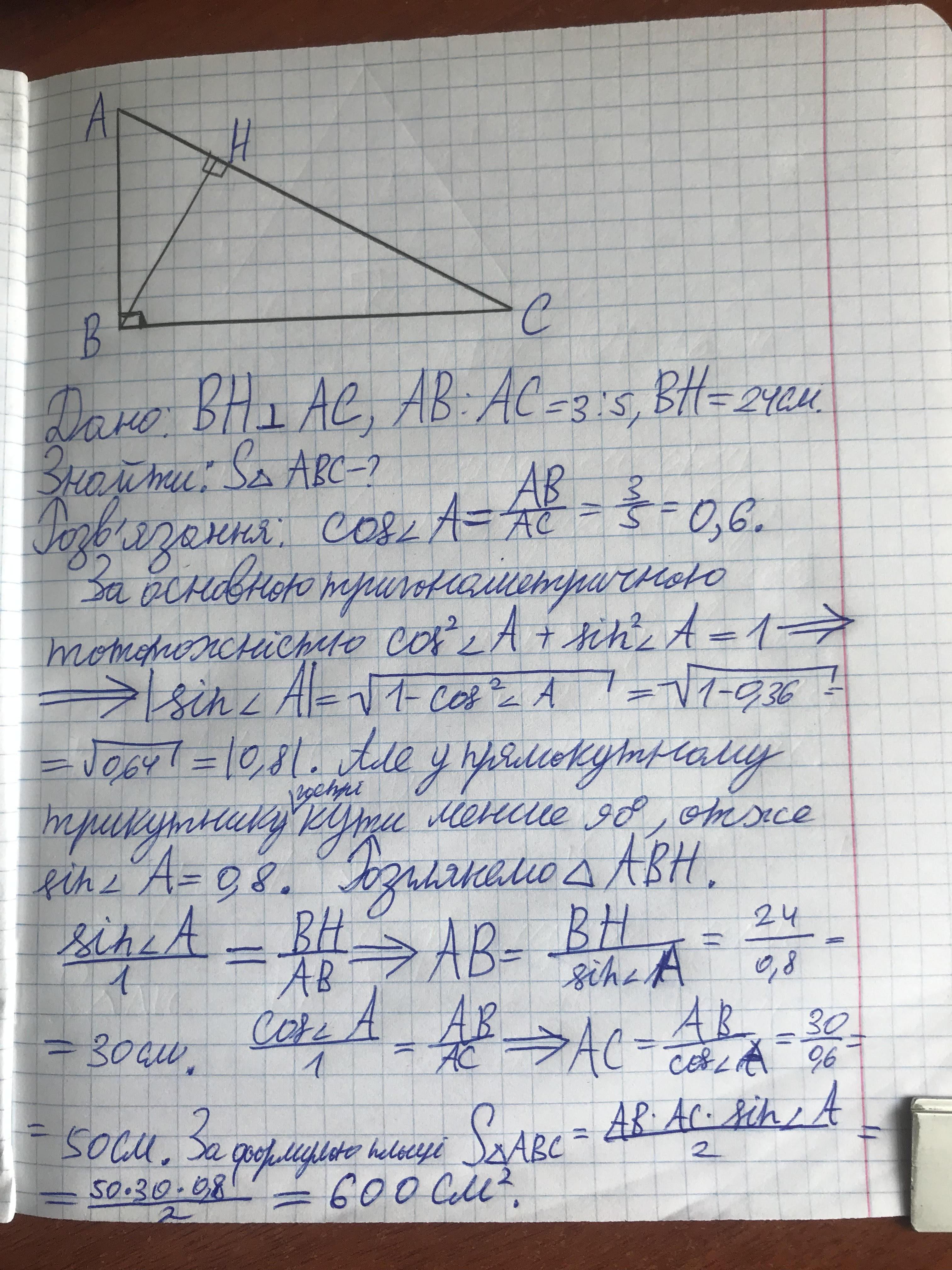 знайдіть площу прямокутного трикутника катет якого відноситься до гіпотенузи як 3:5 ,а висота проведена до гіпотенузи дорівнює 24 см