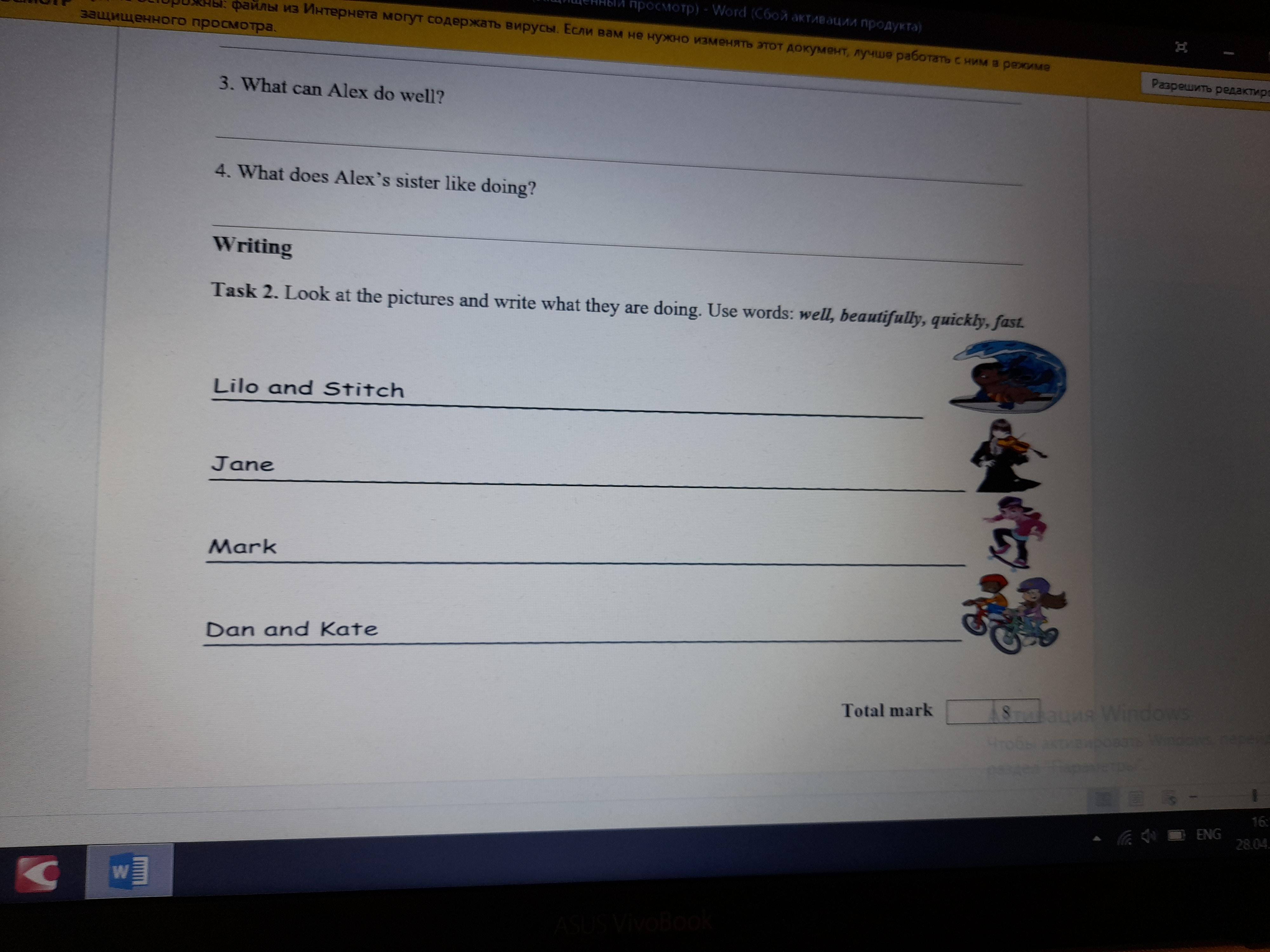 Look at the pictures and write what they are doing.Use words: well, beautifully, quickly, fast