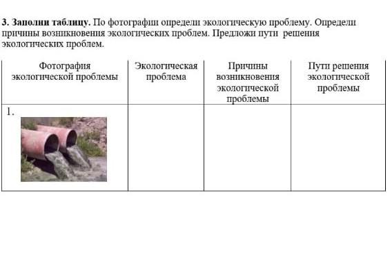 Заполни таблицу. По фотографии определи экологическую проблему. Определи причины возникновения экологических проблем. Предложи пути решения экологических проблем.