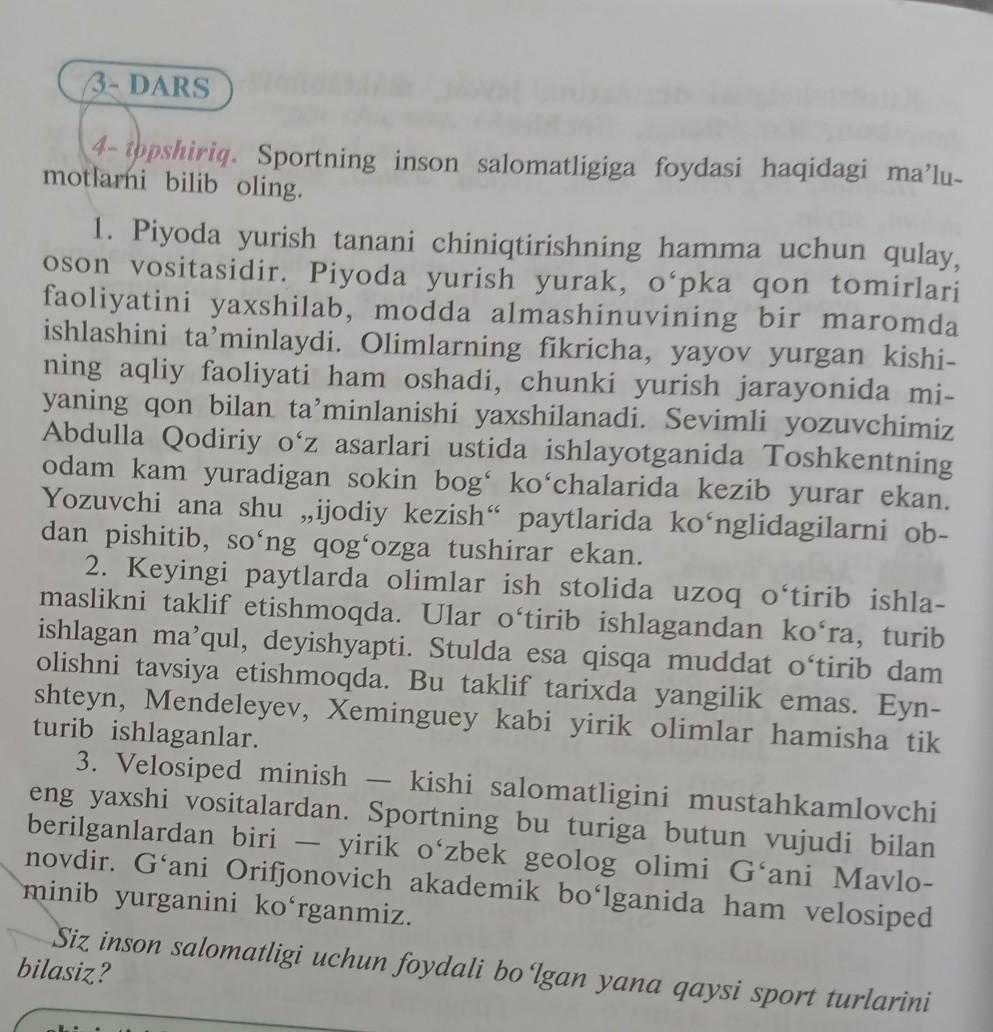 ответьте на вопрос в конце упражнения, примерно 7-8 предложений на Узбекском