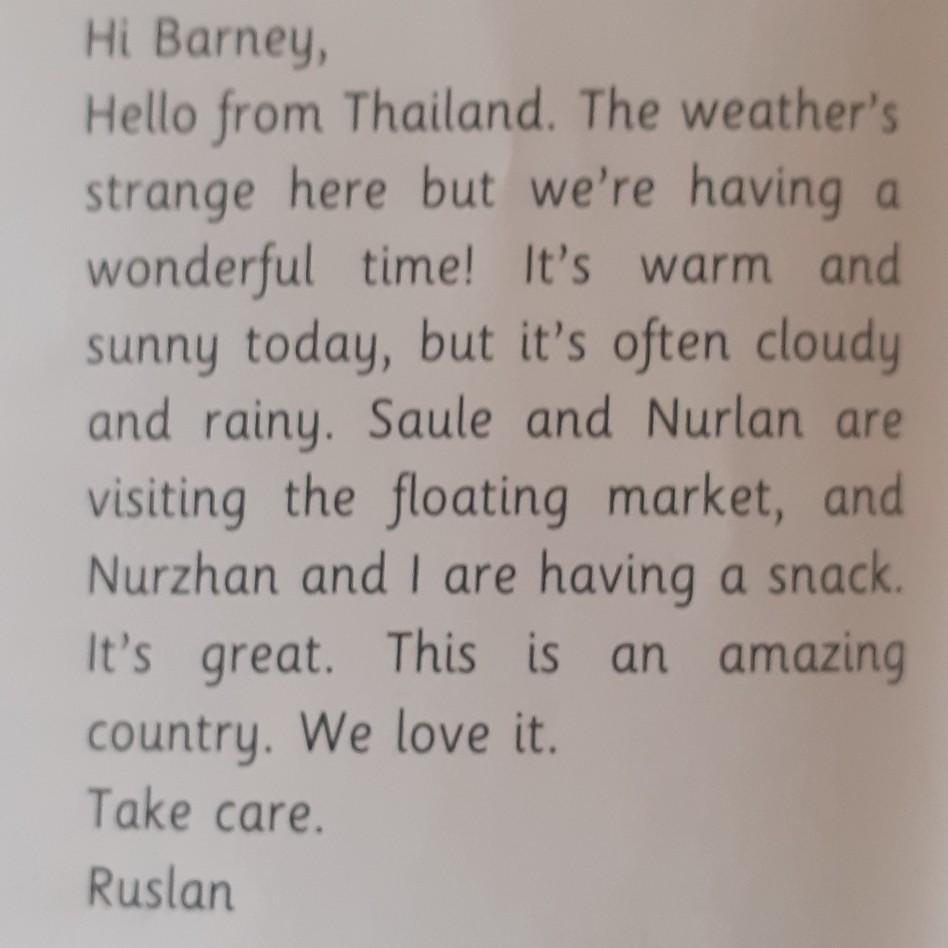 Привет из Таиланда. Погода здесь странная, но мы прекрасно проводим время! Сегодня тепло и солнечно, но часто бывает пасмурно и дождливо. Сауле и Нурлан посещают плавучий рынок, а мы с Нуржаном перекусываем. Здорово. Это удивительная страна. Мы это любим.
