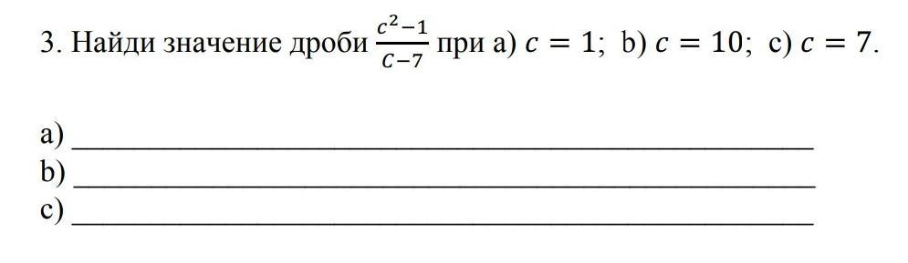 Найди значение дроби c^2-1/c-7 (на скрине посмотрите если не поняли) при a) c = 1; b) c = 10; c) c = 7.