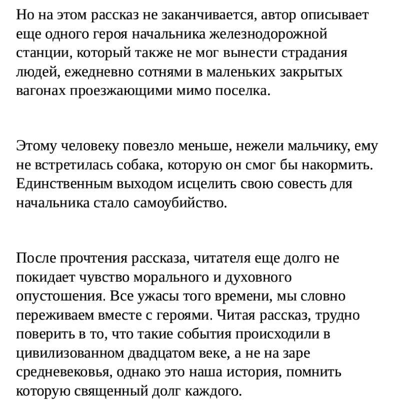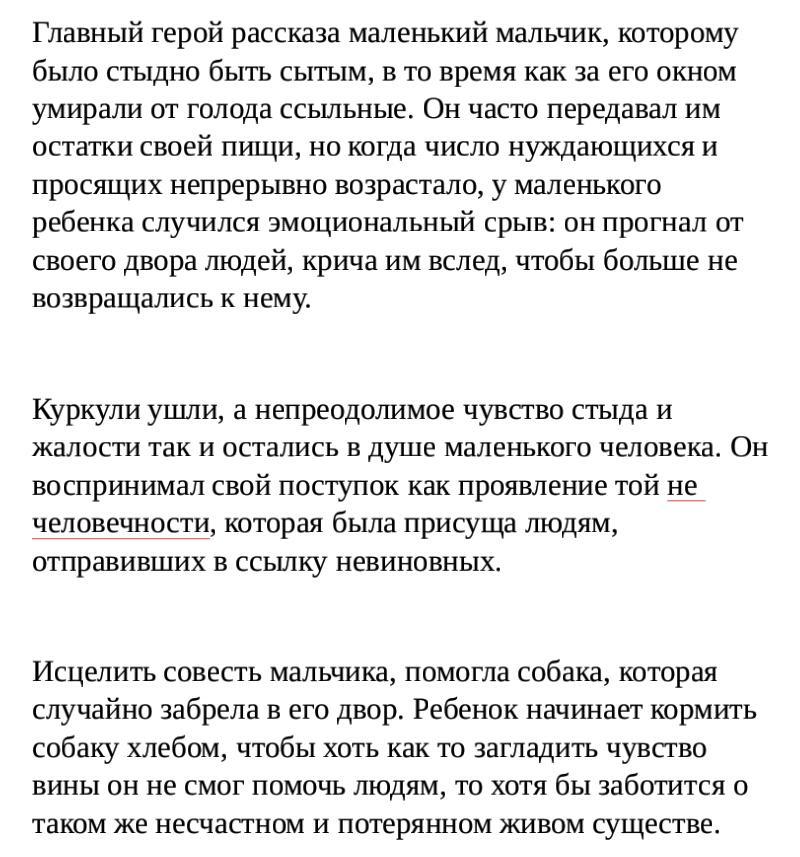 Главный герой рассказа маленький мальчик, которому было стыдно быть сытым, в то время как за его окном умирали от голода ссыльные. Он часто передавал им остатки своей пищи, но когда число нуждающихся и просящих непрерывно возрастало, у маленького ребенка случился эмоциональный срыв: он прогнал от своего двора людей, крича им вслед, чтобы больше не возвращались к нему.