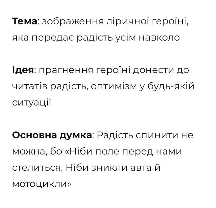 Основна думка: Радість спинити не можна, бо «Ніби поле перед нами стелиться, Ніби зникли авта й мотоцикли»