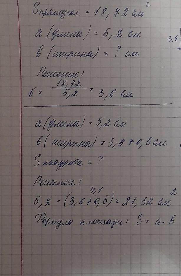 площадь прямоугольника равна 18,72 см2, а длина этого прямоугольника 5,2 см. Ширина данного прямоугольника увеличили на 0,5 см. После преобразования получили квадрат. Найдите площадь квадрата. СРОЧНО!!!!!!!!!