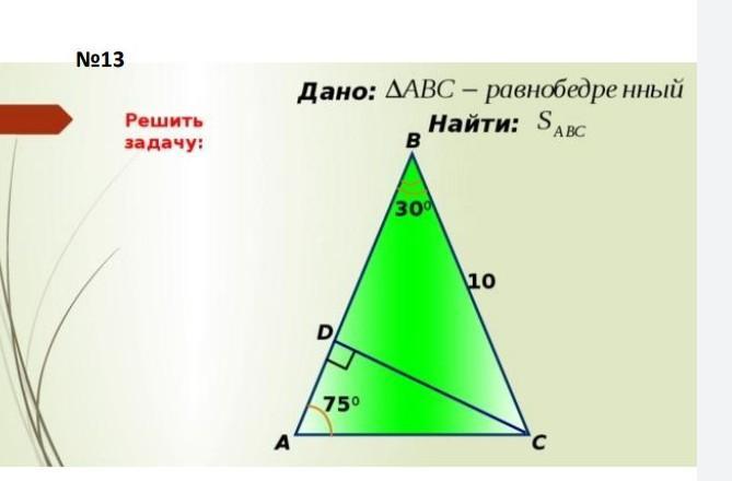 По формуле S = AB * BC * sin ∠ABC * 0,5 = 10 * 10 * 0,5 * 0,5 = 25 сантиметров квадратных.