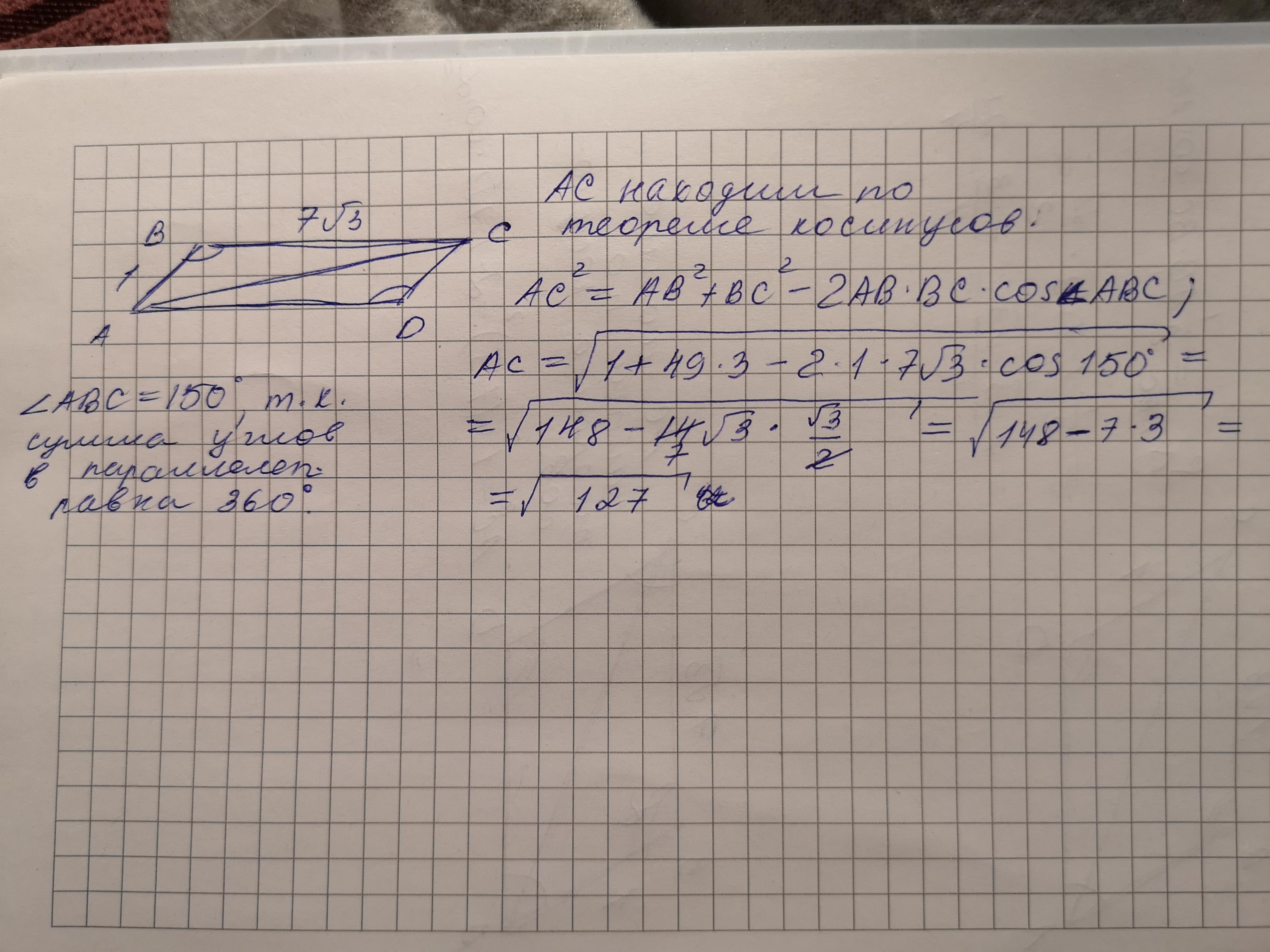 Стороны параллелограма равны( 7 умножить на корень из 3) см и 1см ,один из его углов равен 30 градусов.Найдите большую диагональ параллелограмма.