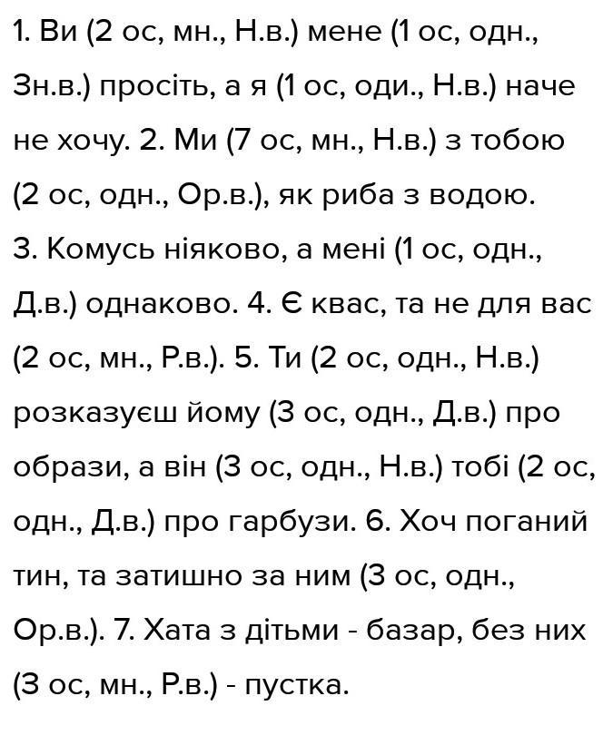 3.Запишіть прислів'я, подані в дужках особові займенники поставте у потрібному відмінку. Визначте особу, число, відмінок кожного займенника. 1.Ви(я)просіть, а я наче не хочу. 2.Ми з (ти), як риба з водою. 3. Комусь ніякоко, а (я)однаково. 4.Є квас, та не для (ви)! 5.Ти розказуєш(він) про образи, а він(ти) про гарбузи. 6.Хоч поганий тин, та затишно за(він). 7.Хата з дітьми - базар, без (вони) - пустка