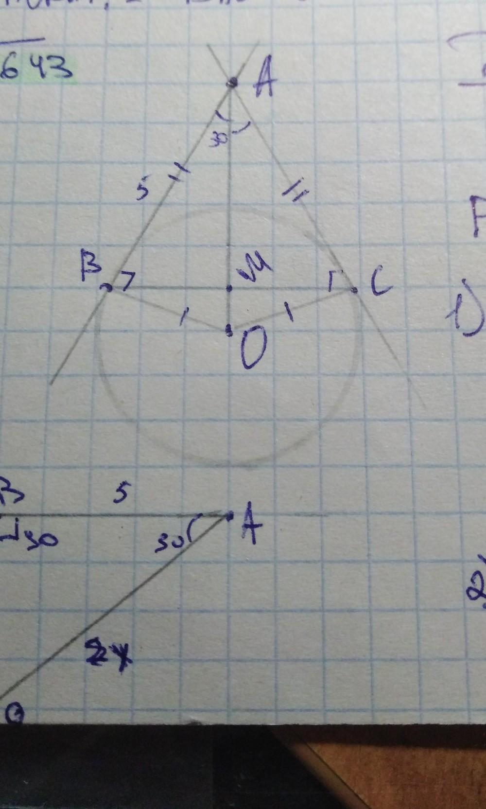 Треугольник АВС равнобедренный (видно на картинке), значит углы при основании равны. АО - биссектриса (так как на рисунке отмечено, что углы ВАО и ОАС равны), значит угол ВАС равен 30*2=60 градусов. Угол АВС равен (180-60)/2=60 градусов. Так как угол АВО прямой, значит угол МВО равен 90-60=30 градусов.