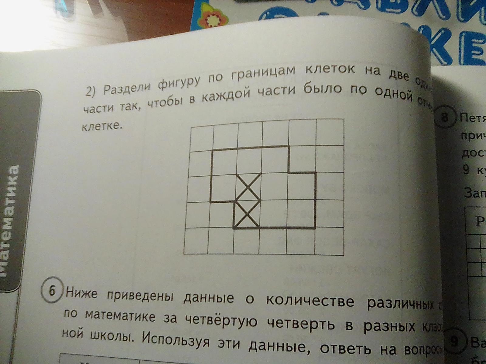 На рисунке изображена фигура первое найди периметр этой фигуры если сторона одной клетки 1 см второе раздели фигуру по границам клеток на две одинаковые части так чтобы в каждой части было по одной отмеченной клетке.