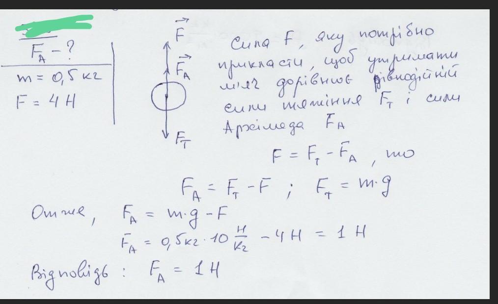 СРОЧНО!!! Щоб утримати у воді м'яч масою 0.5 кг, необхідно прикласти силу 4 Н. Яке значення виштовхувальної сили, яка діє на м'яч?