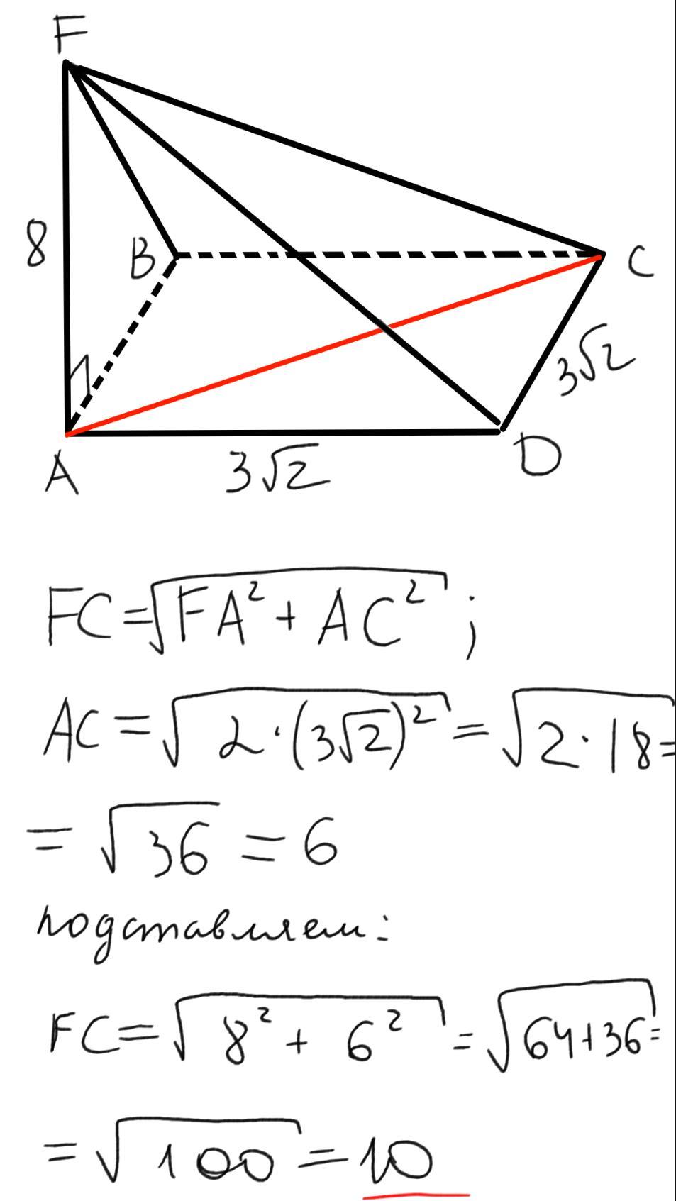 В основании пирамиды FABCD лежит правильный четырехугольник ABCD со стороной 3√2. Боковое ребро FA = 8 перпендикулярно плоскости основания. Найдите длину наибольшего бокового ребра.