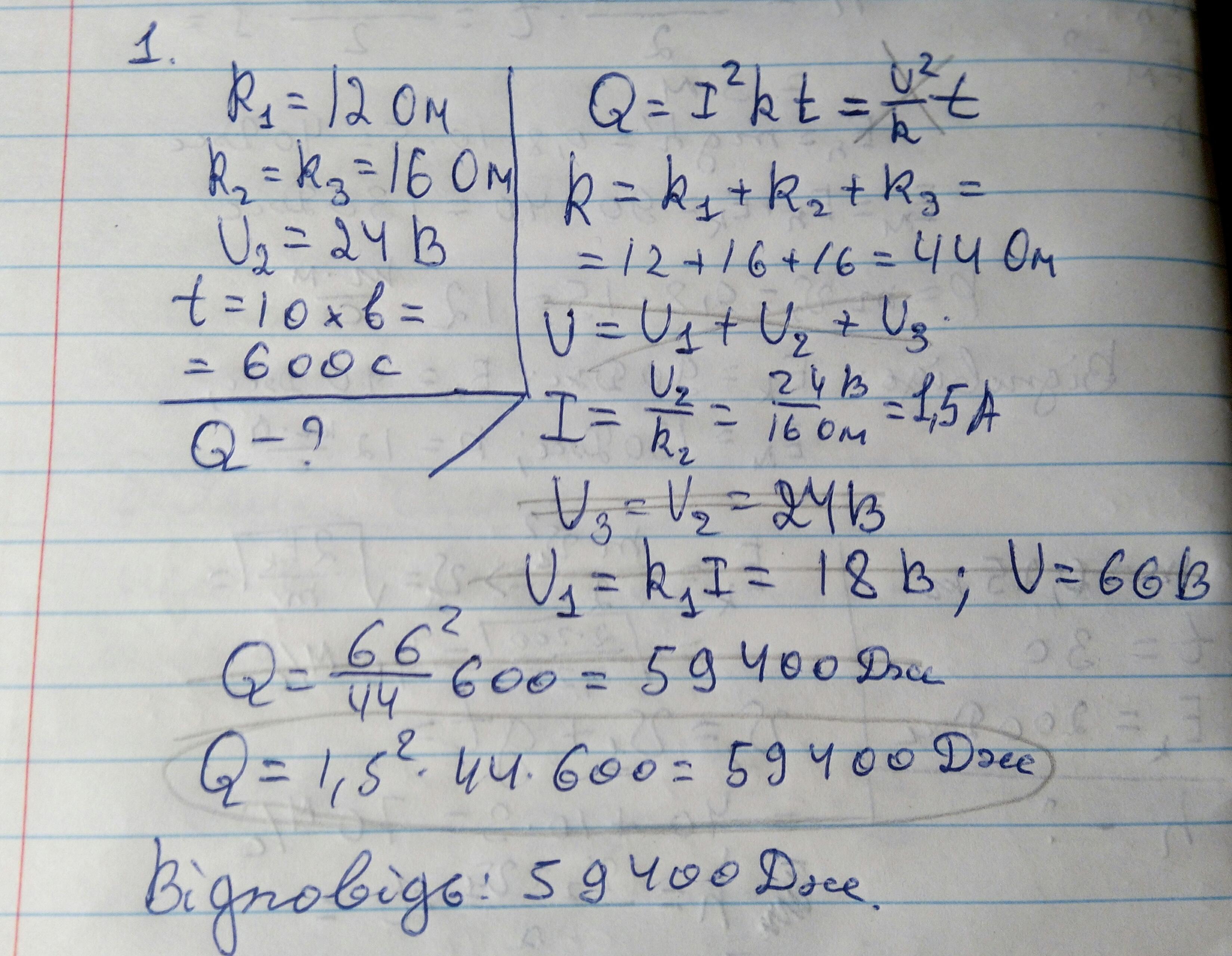 1. Резистор опором 12 Ом, та дві лампочки по 16 Ом кожна зєднані послідовно. Напруга на одній із лампочок рівна 24 В. Яка кількість теплоти виділиться в цій ділянці кола за 10 хв?