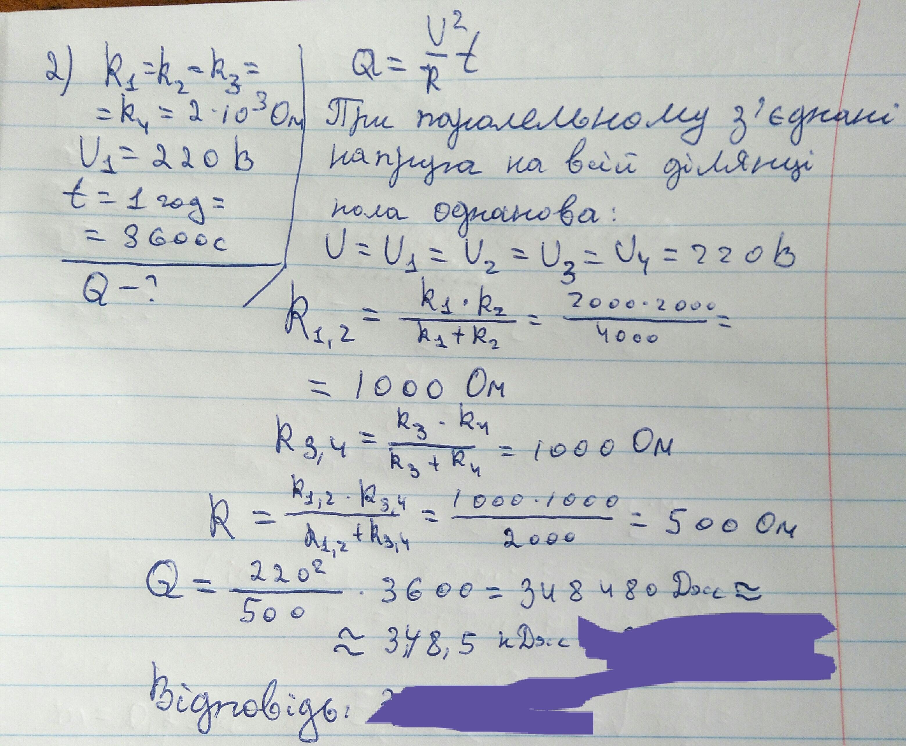 2. Чотири лампочки, опір кожної з яких рівний 2 кОм, зєднані паралельно. Напруга на першій лампочці 220 В. Скільки теплоти виділиться в цьому колі за 1 год?