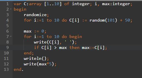 Код и вывод на 1ом и 2ом скринах. Если не нужно, чтобы программа выводила получившийся массив в 1ой строке - удалить 8ую и 11ую строки в коде. Во второй строке вывода - требуемый результат, то бишь, максимальный элемент массива, уже умноженный на 5.