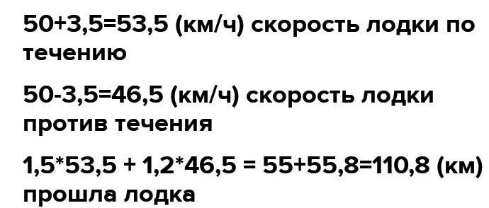 Моторная лодка шла по течению 1,5 часа, а против течения 1,2 часа. Какой путь прошла моторная лодка, если ее собственная скорость 50 км/ч, а скорость течения 3,5 км/ч?