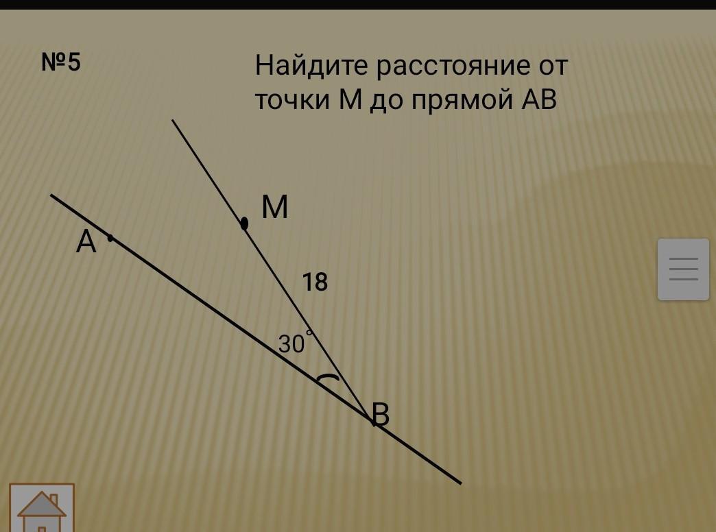 Объяснение: наименьшим расстоянием от точки М до прямой АВ будет перпендикуляр, опущенный с точки М на прямую АВ. Этот перпендикуляр образует прямоугольный треугольник с гипотенузой МВ и катетами МК и КВ. Катет МК лежит против угла 30° и равен половине гипотенузы и будет равен 18/2=9. Расстояние от точки М до прямой АВ равно 9