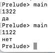 - putStrLn $ if f (show k) then "да" else "нет"