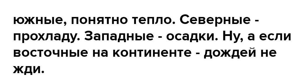 южные, понятно тепло. Северные - прохладу. Западные - осадки. Ну, а если восточные на континенте - дождей не жди.