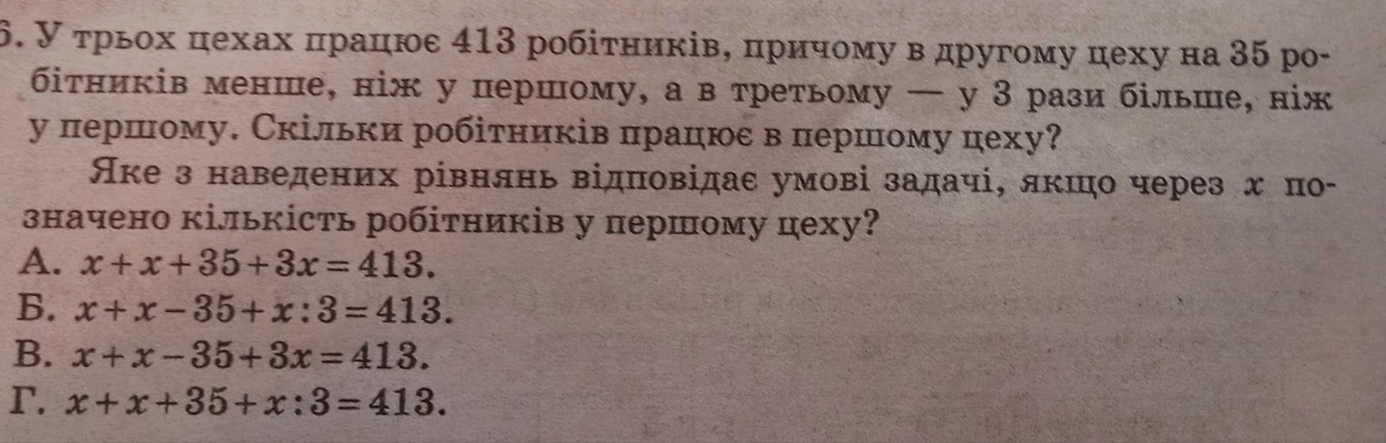 Обозначим кол-во работников в первом цехе за х, тогда во 2м работает (х-35) работников, а следовательно в 3м - 3*х. Всего, по условию, 413 работников. Составим уравнение: