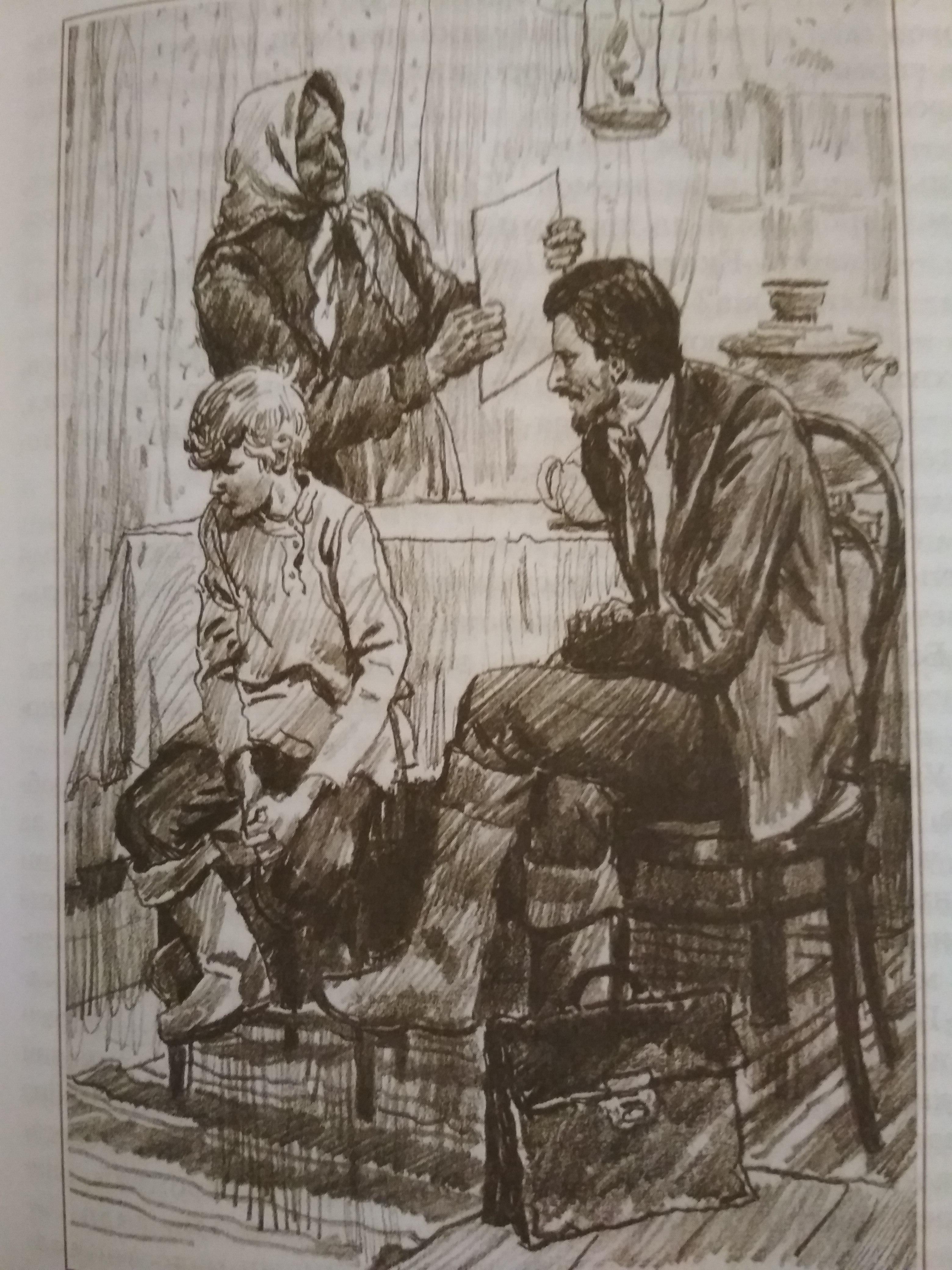 На переднем плане автор показывает нам , как юноша сидит рядом со своими родителями/бабушкой и дедушкой. Он чем то смущён , возможно провинился . Они с Отцом/Дедом сидят на деревянных стульях и видимо что то обговаривают. возле отца/деда стоит старый портфель ,опираясь на ножку стула. на заднем плане , мать / бабушка с интересом разглядывает какой то листок , возможно она читает что то интересное или важное.Она стоит за столом , словно собиралась что то приготовить для своей семьи.