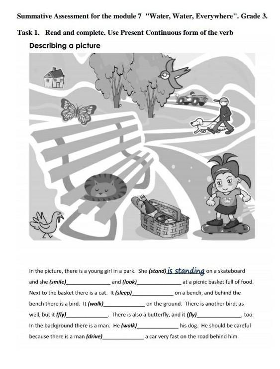 In the picture, there is a young girl in the park. She is starting on a skateboard and she is smiling and looking at the picnic basket full of food. Next to the basket there is a cat. It is sleeping on a bench, and behind the bench there is a bird. It is walking on a ground, there is another bird, as well, but it is flying.there is also butterfly, and it is flying, too. In the background there is a man. He is walking his dog. He should be careful because there is a man driving a car very fast on the road behind him
