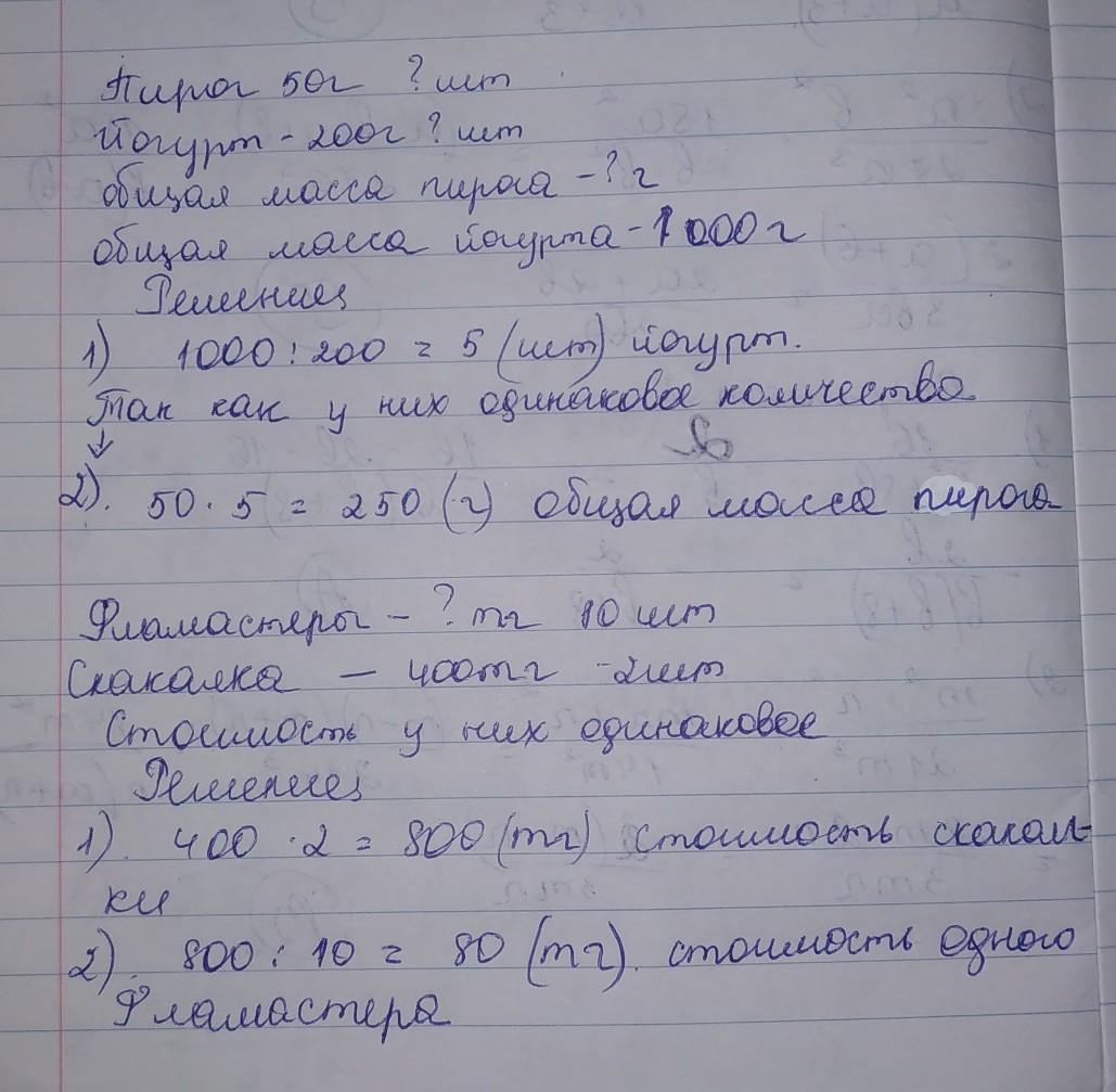 Общая масса йогурта- 1000г. 1) 1000:200=5 шт 2)50×5=250г Ответ: общая масса пирожных 250г. Количество йогуртов-5