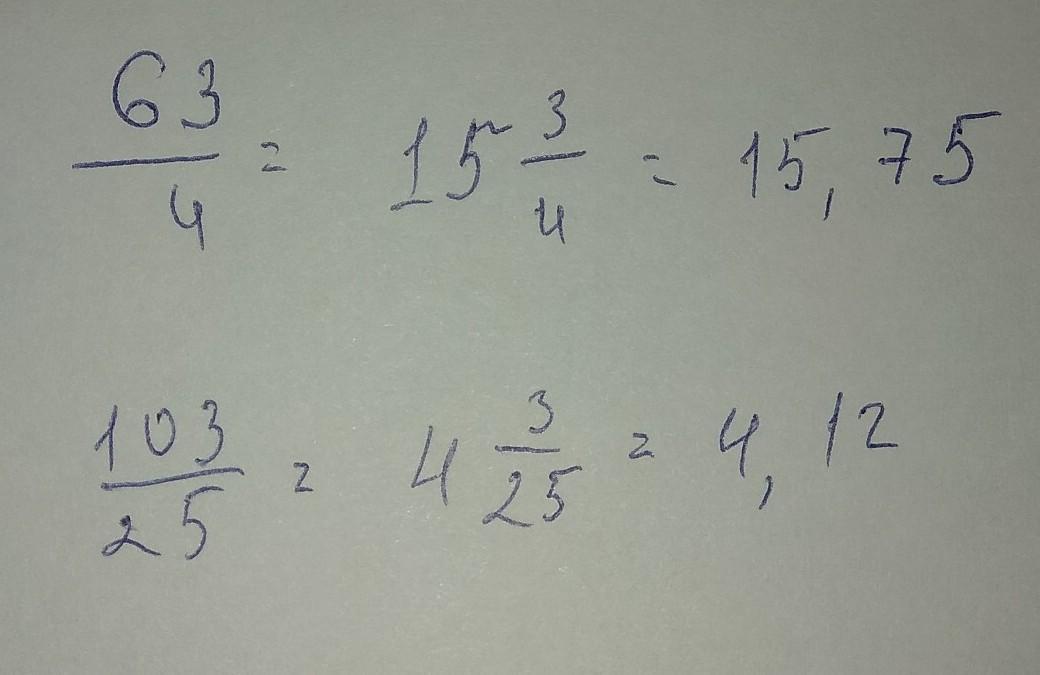 представьте дроби 63/4 и 103/25 в виде десятичных дробей,разделив числитель и знаменатель помогите плиз