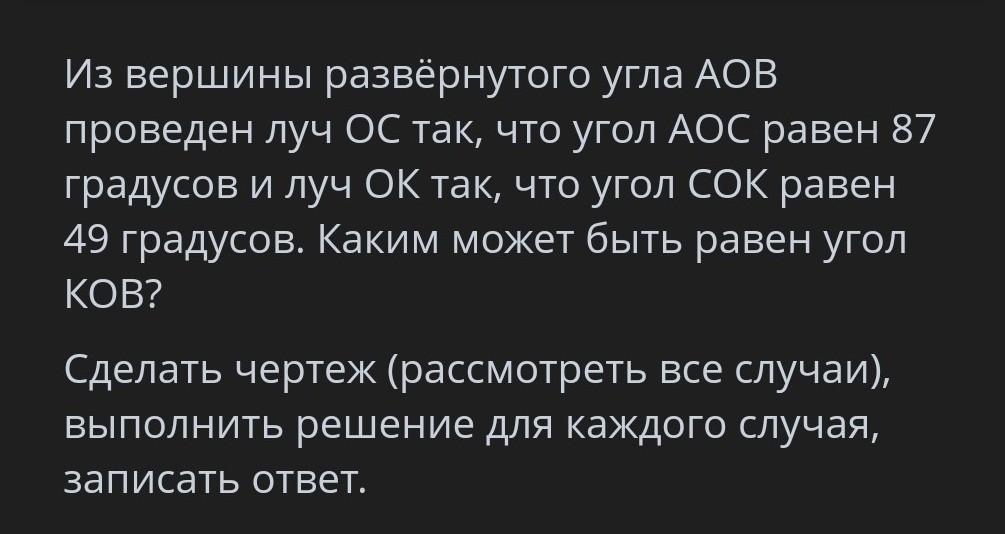 Из вершины развёрнутое угла AOB проведён луч OC так, что угол AOC равен 87 градусов и луч OK так, что угол COK равен 49 градусов. Каким может быть равен угол KOB?