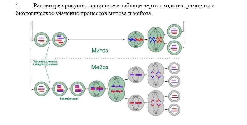 1. Рассмотрев рисунок, напишите в таблице черты сходства, различия и биологическое значение процессов митоза и мейоза. ПОМОГИТЕ ПОЖАЛУЙСТА СРОЧНО