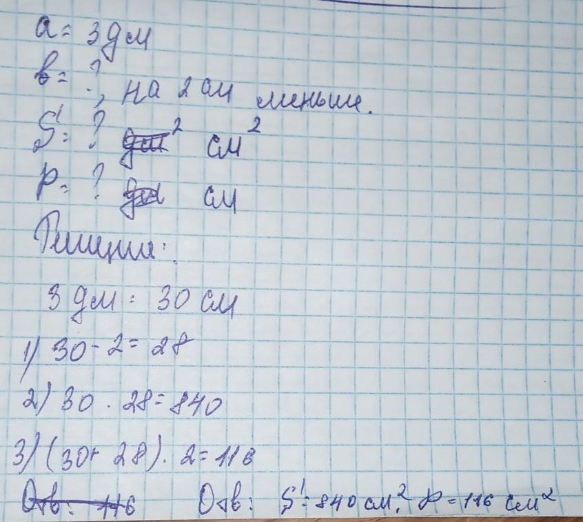 Длина прямоугольника равна 3 дм а ширина на 2 см меньше найдите площадь и периметр.