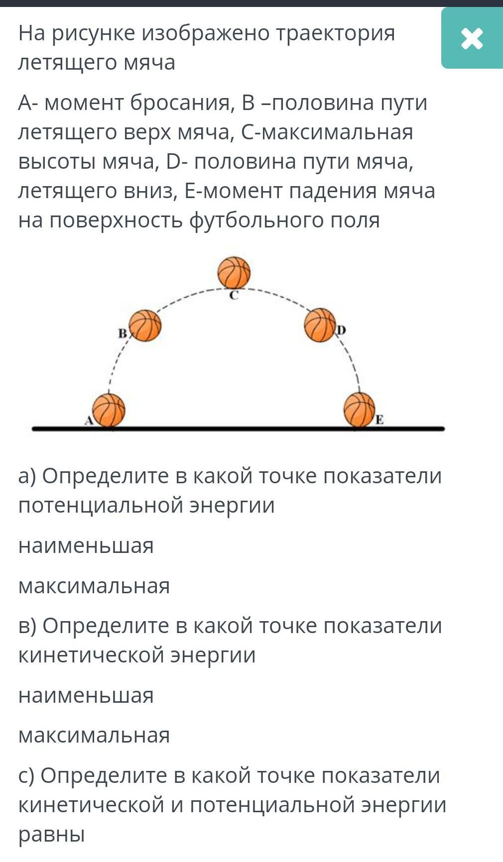 На рисунке изображено траектория летящего мяча А- момент бросания, В-половина пути летящего верх мяча, С-максимальная высоты мяча, D- половина пути мяча, летящего вниз, Е-момент падения мяча на поверхность футбольного поля E а) Определите в какой точке показатели потенциальной энергии наименьшая максимальная в) Определите в кинетической энергии наименьшая максимальная c) Определите в какой точке показатели кинетической и потенциальной энергии равны какой точке показатели