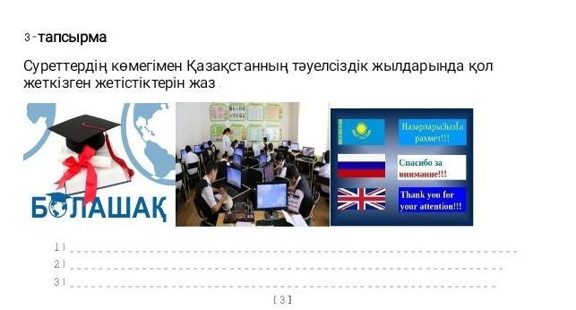 1) Қазақстан тәуелсіздік алған кезден бастап халықтың әсіресе соның ішінде жастардың болашағы өркендей бастады. Шет елдерден білімін шыңдап, соны өз халқымызға беріп жатқан білімді жастар да аз емес.