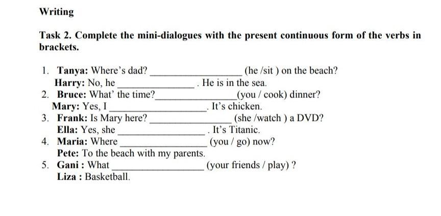 Task 2. Complete the mini-dialogues with the present continuous form of the verbs in
