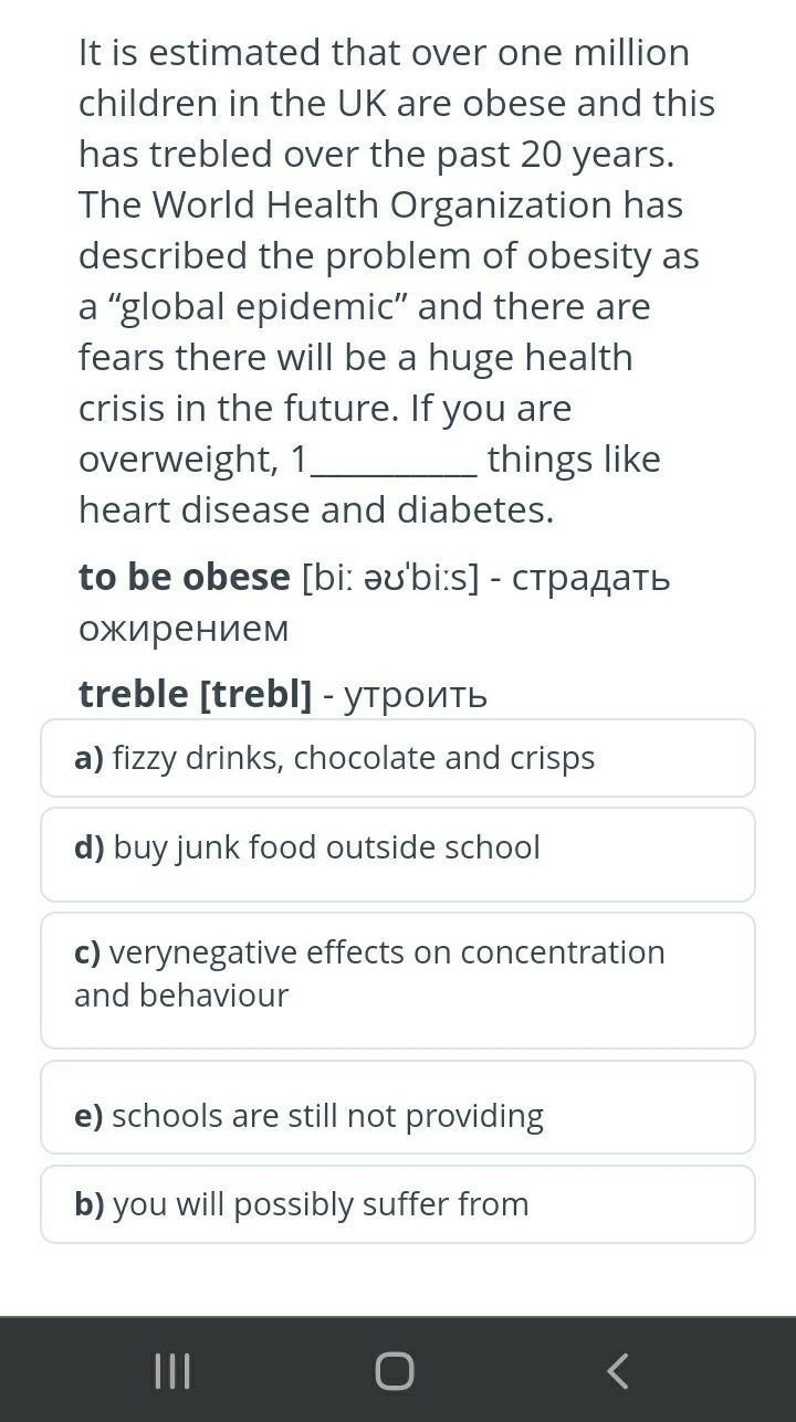 Объяснение: 1. You will possibly suffer from things like heart disease and diabetes. - Вы можете страдать от болезней сердца и диабета.