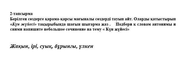 Берілген сөздерге қарама-қарсы мағыналы сөздерді тауып айт. Оларды қатыстырып «Күн жүйесі» тақырыбында шағын шығарма жаз